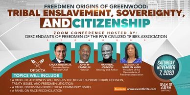 On November 7, 2020, the Descendants of Freedmen of the Five Civilized Tribes Association and the African Indians of the 5 Civilized Tribes Foundation held their First Virtual Conference sponsored in part through a grant from the 1921 Tulsa Race Massacre Centennial Commission & WPX Energy. Special Guest speaker was Cherokee Nation Principal Chief Chuck Hoskin. Featured Speaker was Freedmen descendant John W. Franklin, Senior Manager emeritus, National Museum of African American History and Culture. A lawyers panel included Cherokee Nation District Court Judge Luke Barteaux, former Creek Nation Assistant Attorney General John Parris, and Public Defender of the Colorado River Indian Tribe, Branton Grissum. A panel of African Americans of tribal and nontribal heritage included attorney/author Hannibal B. Johnson, author/retired professor Art Burton, and author/genealogist Angela Walton-Raji, a Choctaw freedmen descendant discussed North Tulsa Community Issues. Panelists Cherokee Tribal Councilman Joe Deere, author/journalist Randy Krehbiel, and Kristi Williams, Chairman of the Greater Tulsa African American Affairs Commission and a descendant of Creek and Cherokee freedmen, discussed race reconciliation. Other speakers included historians Eli Grayson and David Cornsilk and Cherokee Nation citizen Reuben Gant, Exec Dir John Hope Franklin Center for Reconciliation.